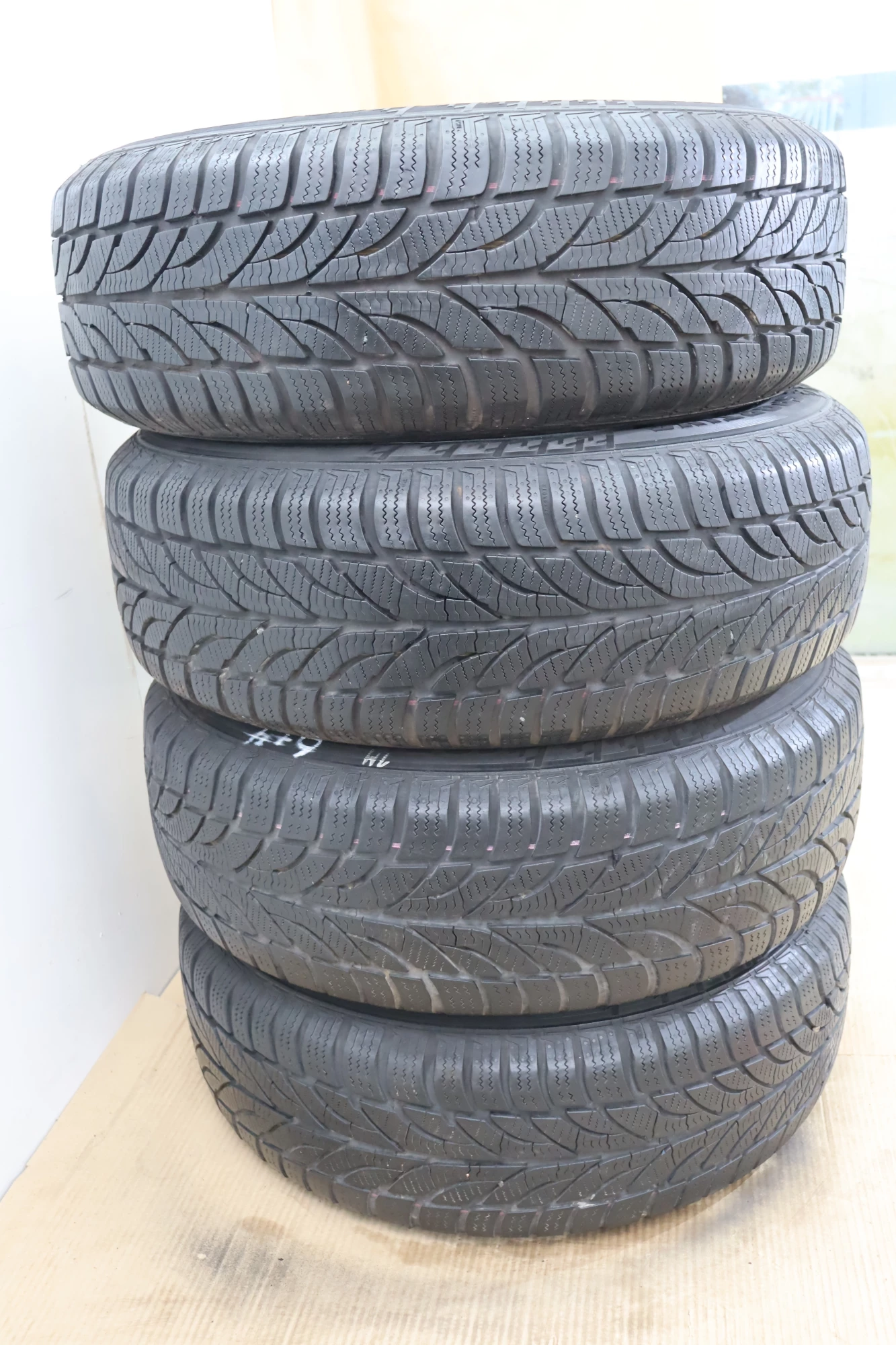Angeboten wird ein Satz Winterreifen mit ca. 2x um die 4-6mm Profil und 2x 6-7mm Profil, von Sportiva, Herstellung 2313, 195/65 R15 91H, auf Felge 6jx15H2 ET38 aus einem VW Golf 4 Bj. 2000.