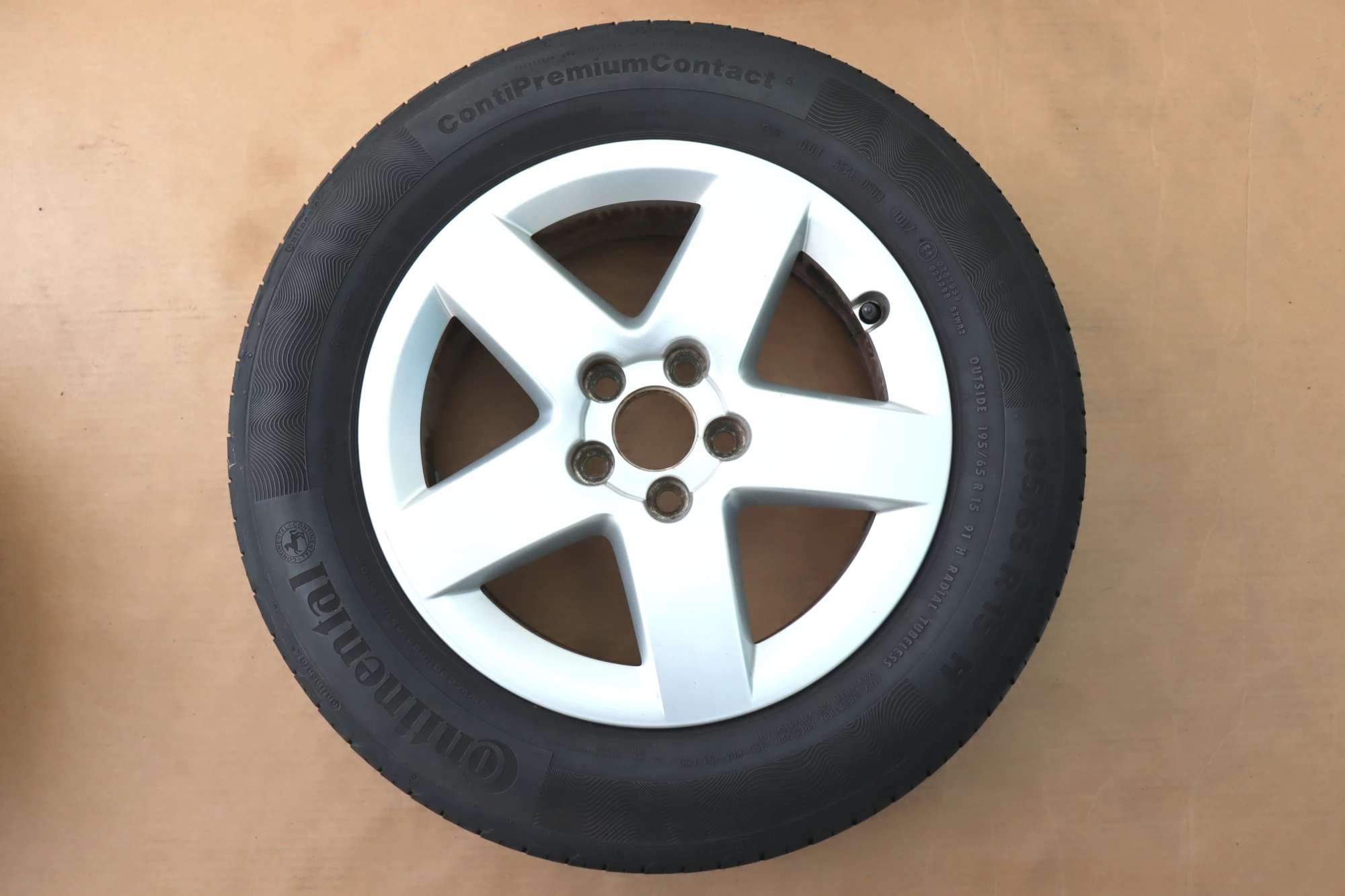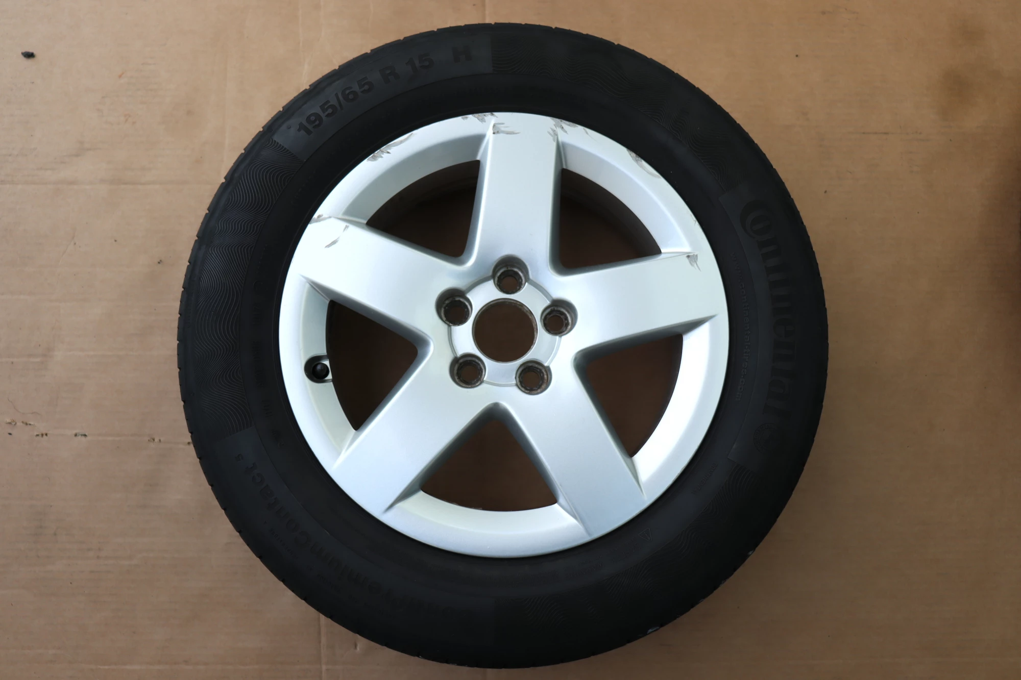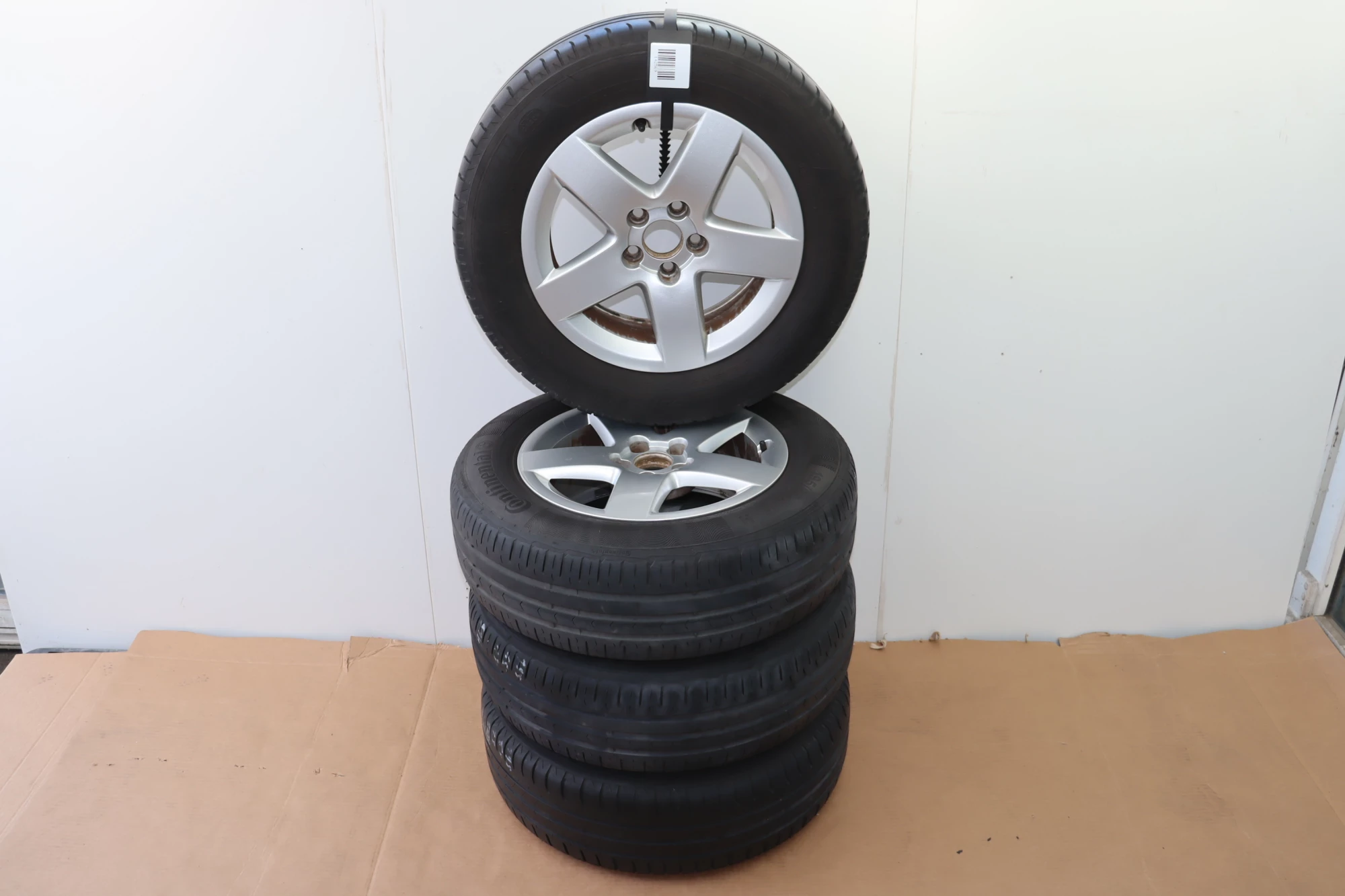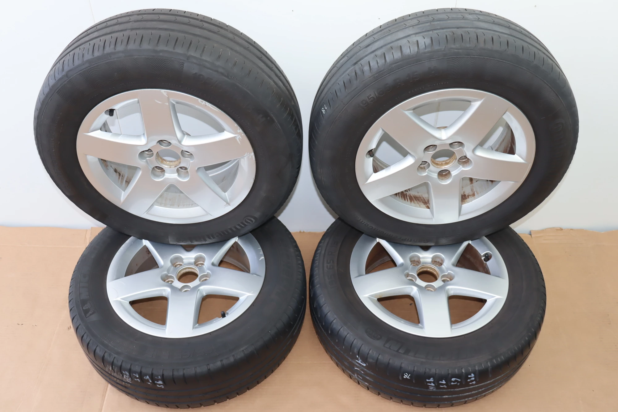 Angeboten wird ein Satz Alufelgen mit Sommerreifen 195/65 R15 91H, 2x ca. 3mm Profil und 2x ca. 4mm Profil, von Continental und Michelin, Herstellung 2x 1017 und 2x 4713 auf Audi Felge 8L0601025P 6jx15H2 ET38 aus einem Audi A3 8L Bj. 2000.