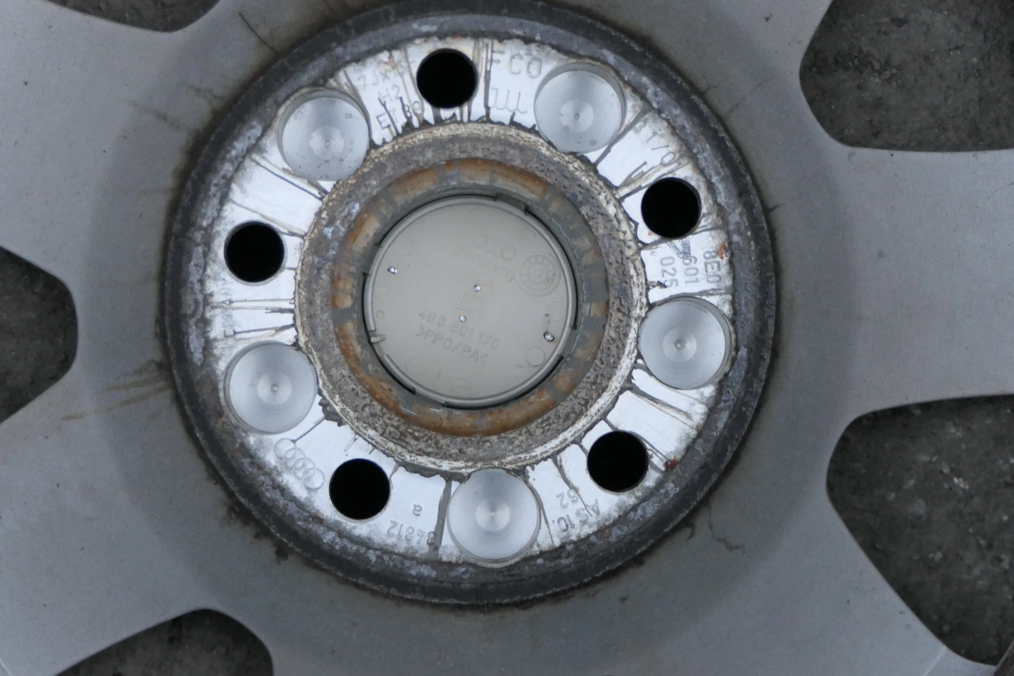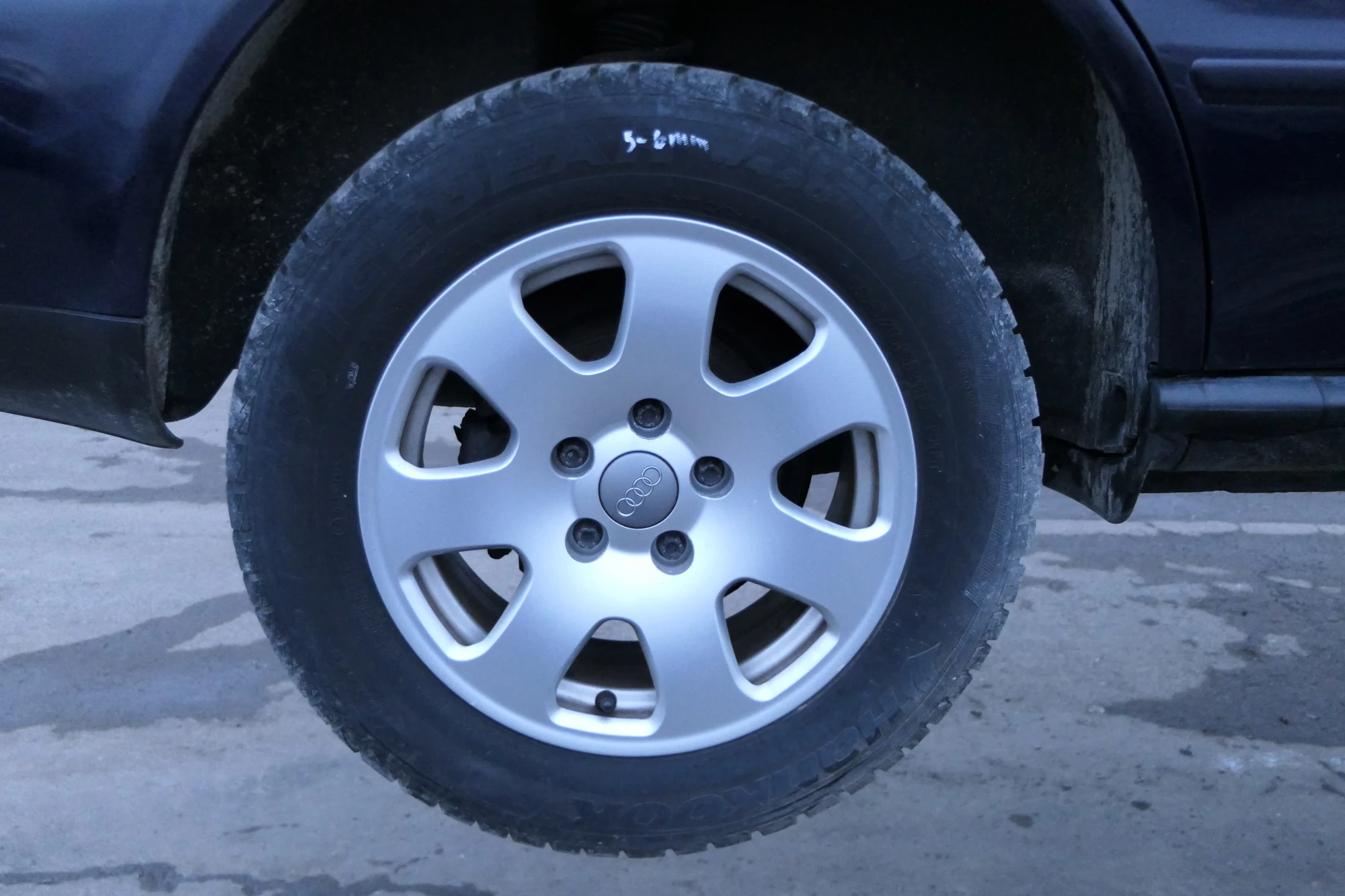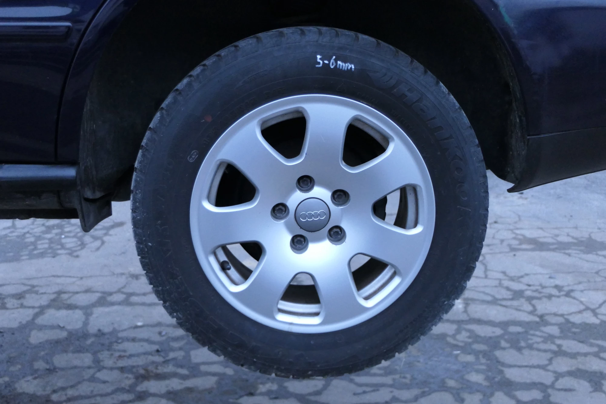 Angeboten wird ein Satz Alufelgen mit Hankook Reifen mit 2x ca. 4mm Profil, Herstellung 0910 und 2x ca. 5-6mm Profil auf Felge 7Jx15H2 ET39, aus einem Audi A6 4B Bj. 2002.