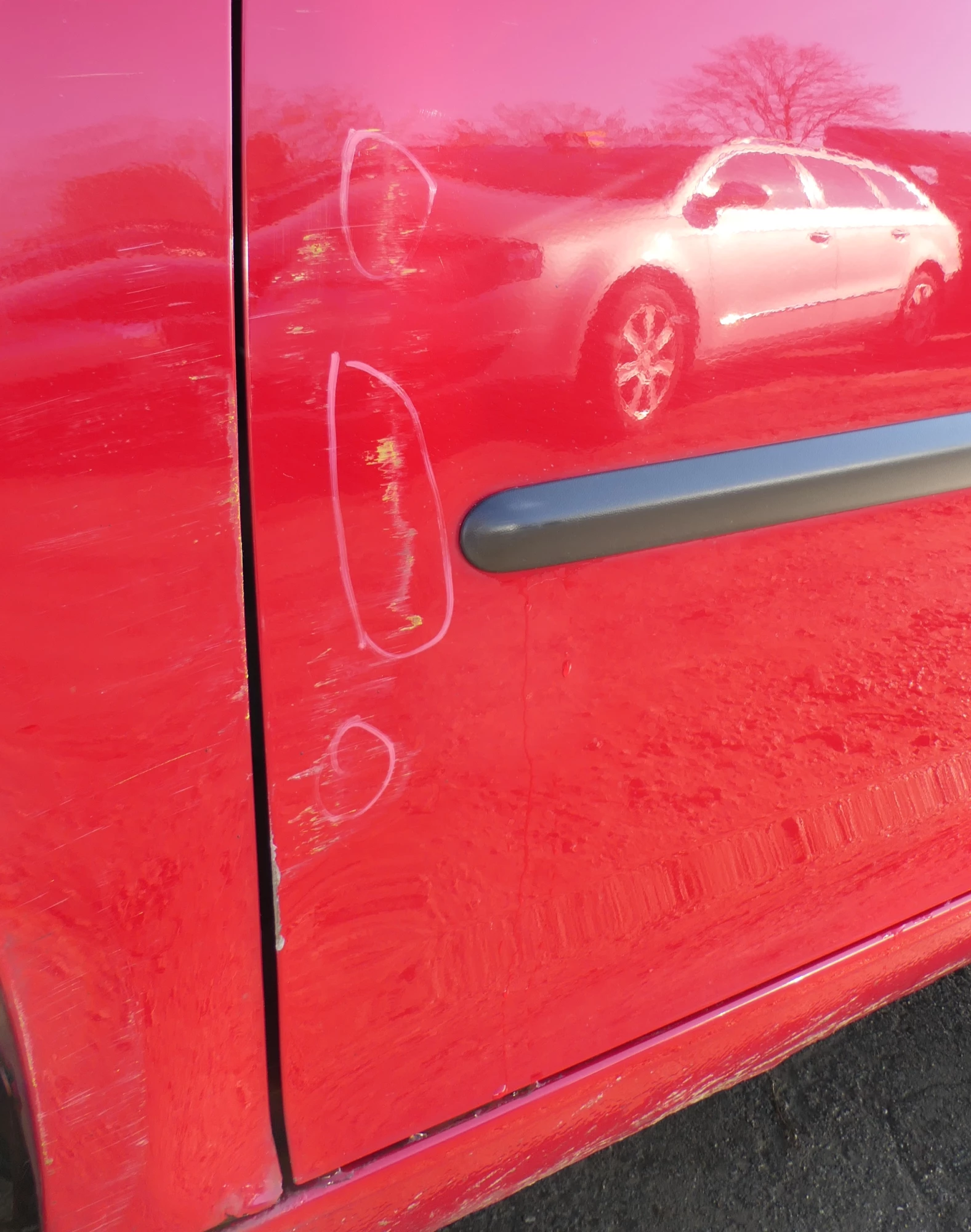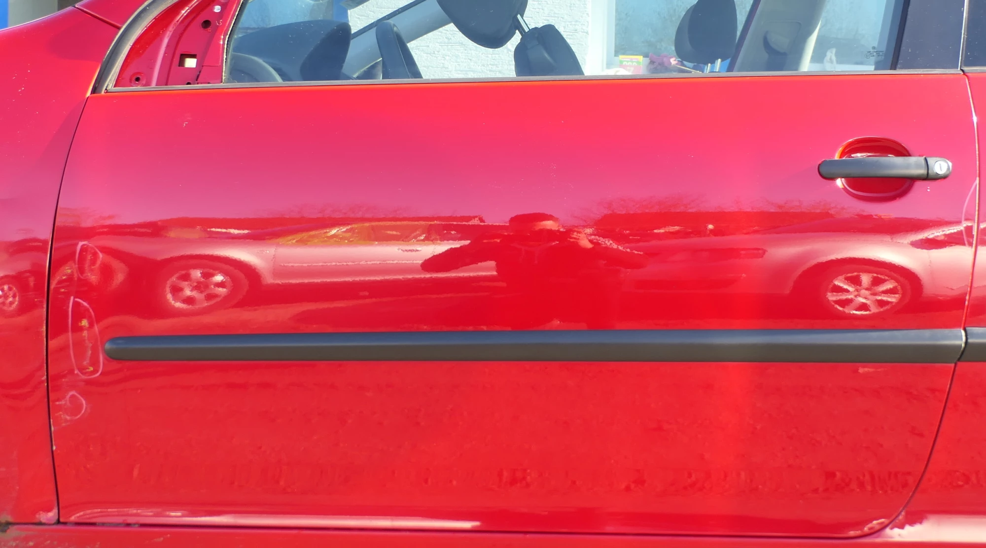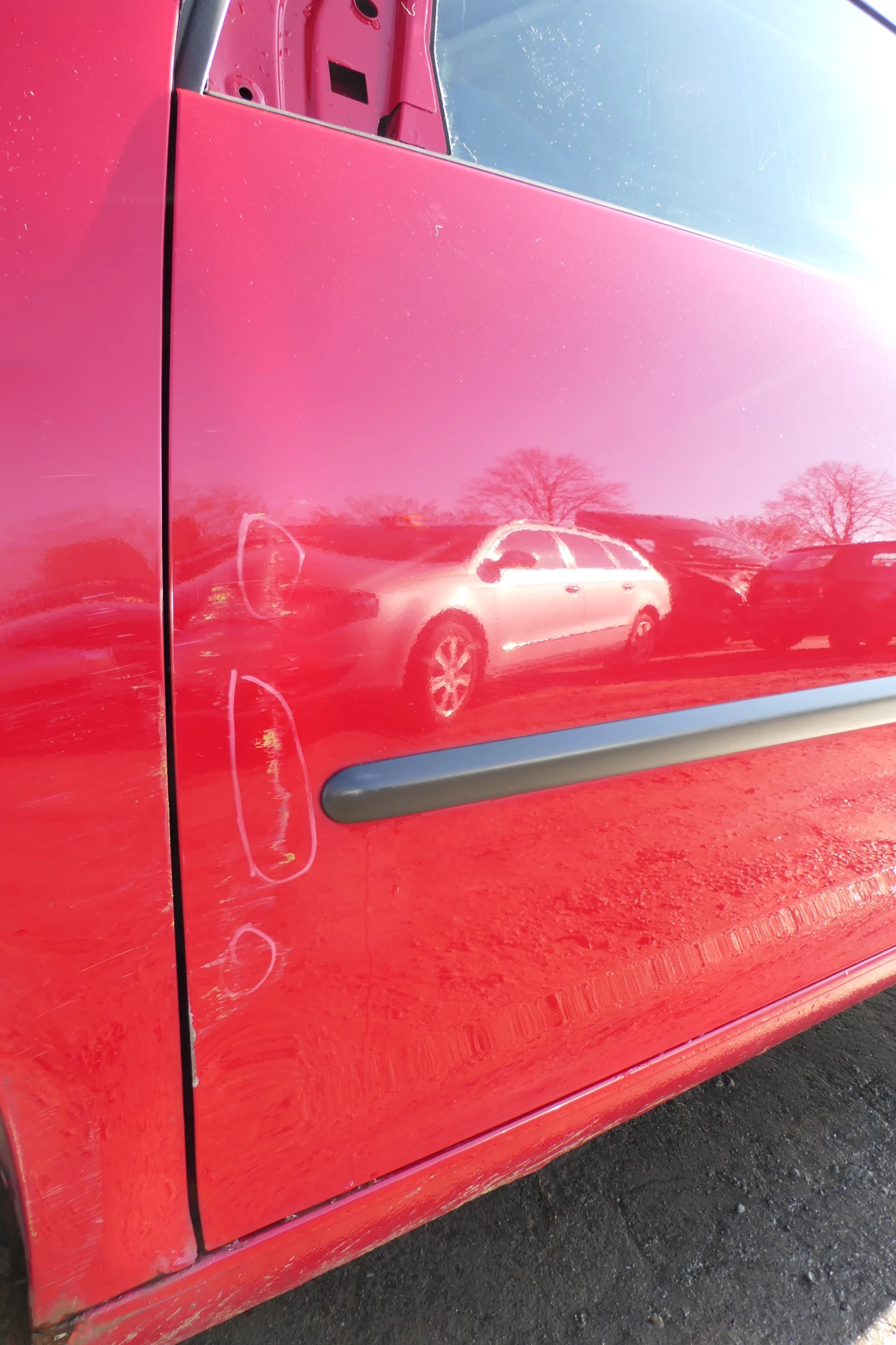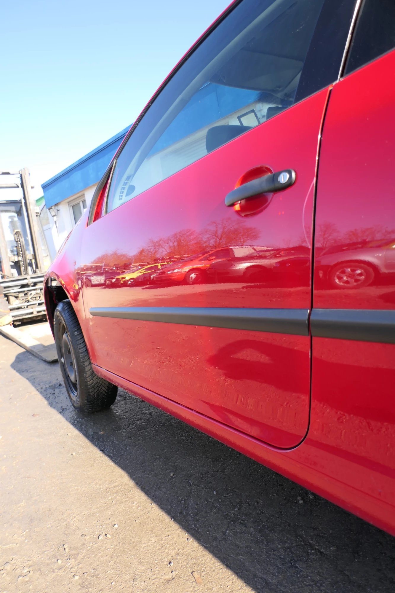 Leider ein paar Dellen, vorne zum Kotflügel hin. Angeboten wird ein Türblatt (nur das lackierte Blech, ohne Anbauteile) aus einem VW Golf 5 2/3-Türer Bj. 2005.
