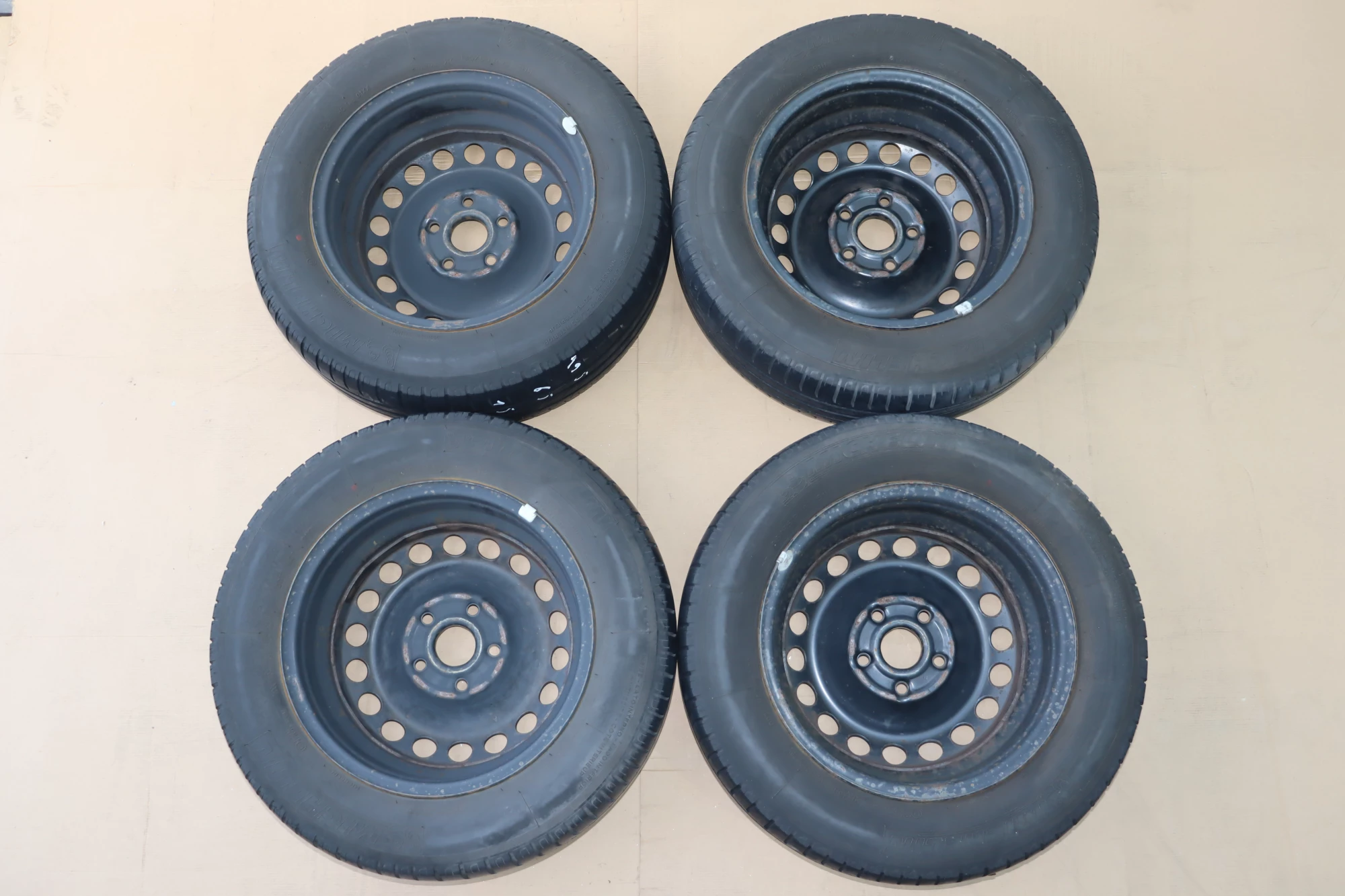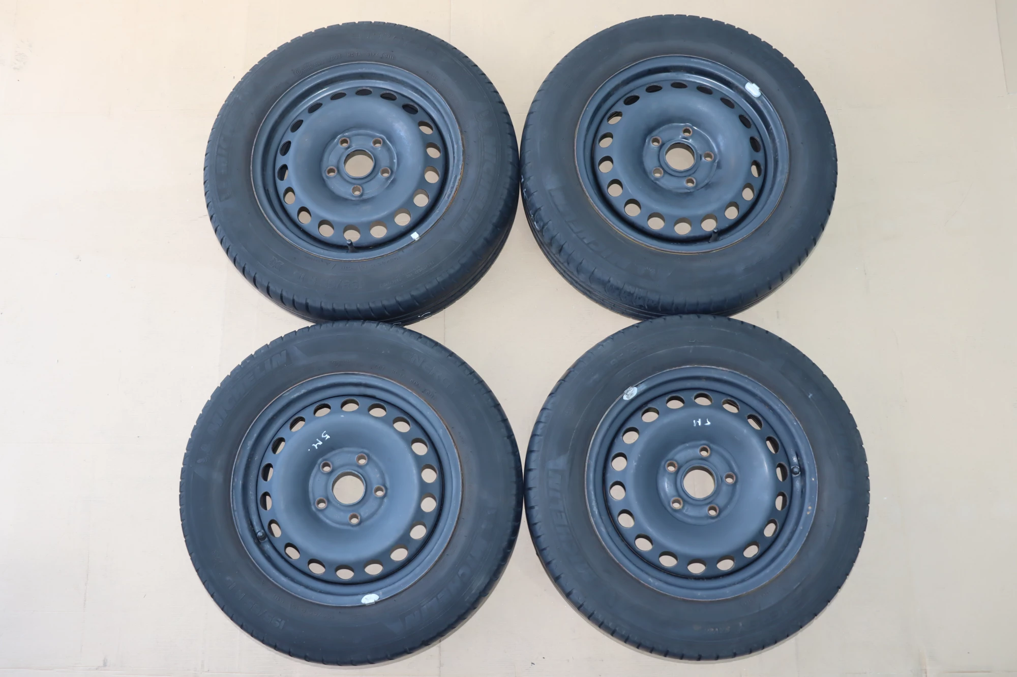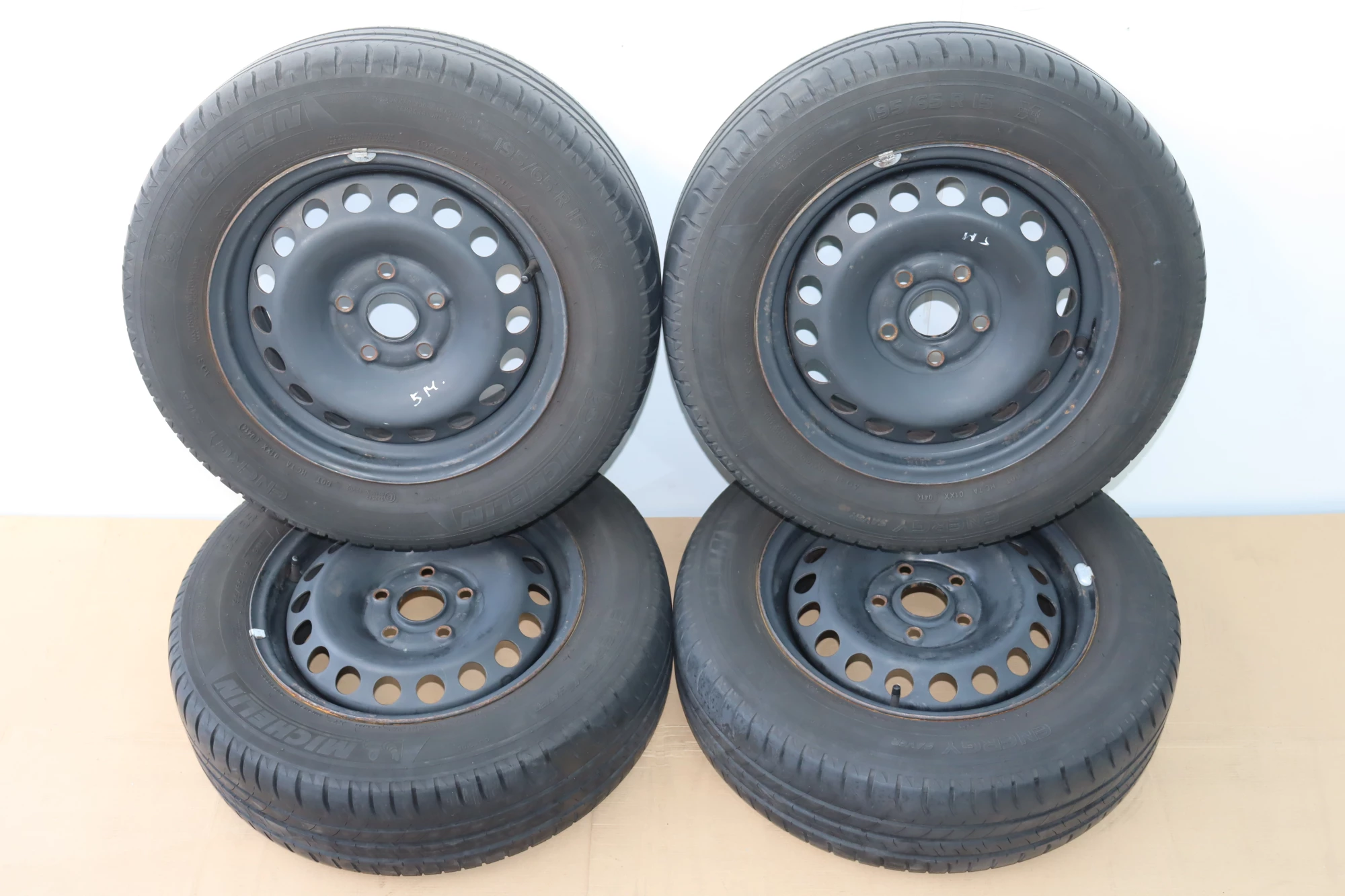 Angeboten wird ein Satz Reifen, Hersteller Michelin, Herstellung 0414, ca. 3-5mm Profil je Reifen, auf Felge 6jx15H2 ET47 aus einem VW Golf.